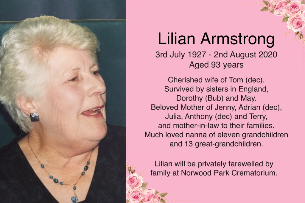 Lilian Armstrong’s Death and Funeral Notice Posted on August 5, 2020August 6, 2020 by C Carroll Please see below for details on how to view the service. Click here to view the service. 5232 is the code. Share this: Share on Facebook (Opens in new window) Facebook Email a link to a friend (Opens in new window) Email Like Loading...