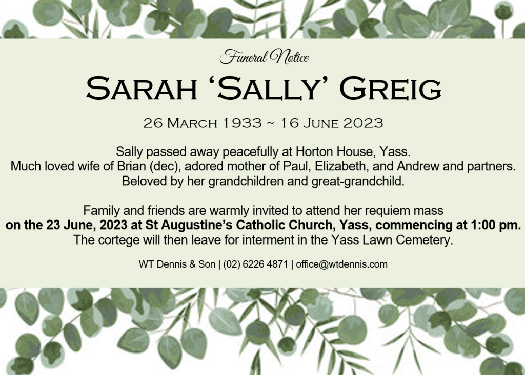 on the 23 June, 2023 at St Augustine’s Catholic Church, Yass, commencing at 1:00 pm.