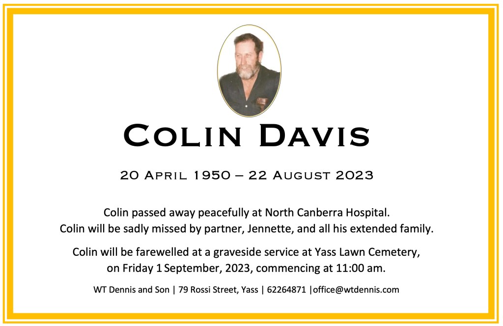 Colin will be farewelled at a graveside service at Yass Lawn Cemetery