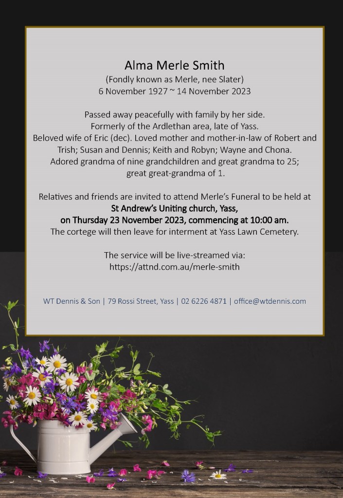 In loving memory of Alma Smith Posted on November 20, 2023November 20, 2023 by C Carroll The service will be live-streamed via: https://attnd.com.au/merle-smith Share this: Share on Facebook (Opens in new window) Facebook Email a link to a friend (Opens in new window) Email Like Loading...