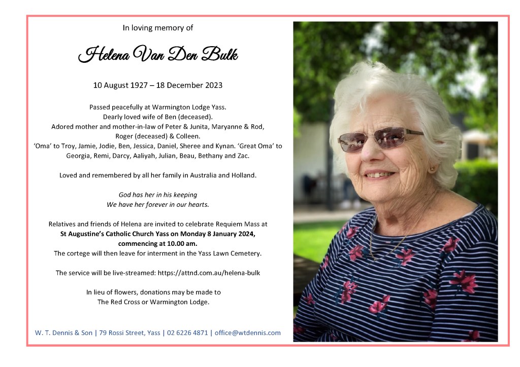 Relatives and friends of Helena are invited to celebrate Requiem Mass at St Augustine’s Catholic Church Yass on Monday 8 January 2024, commencing at 10.00 am. The cortege will then leave for interment in the Yass Lawn Cemetery.