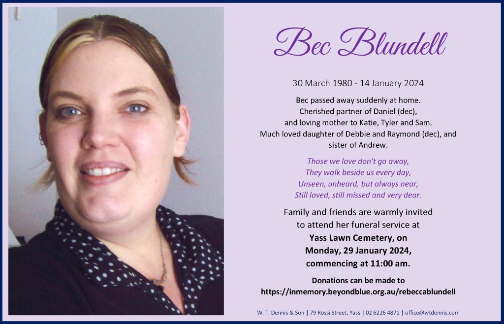 Donations can be made to https://inmemory.beyondblue.org.au/rebeccablundell