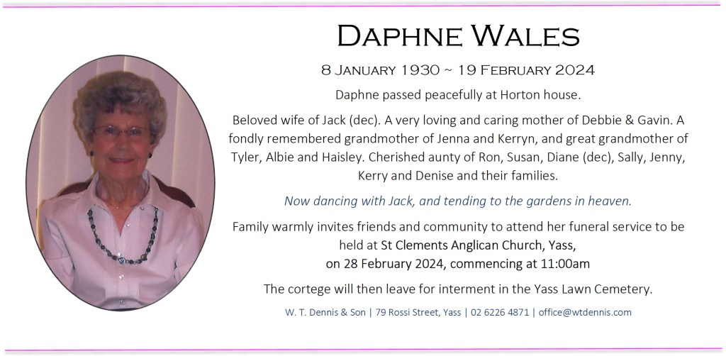 The cortege will then leave for interment in the Yass Lawn Cemetery.