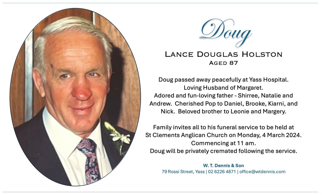 Doug’s family invites all to his funeral service at St Clements Anglican Church on Monday, 4 March 2024. Commencing at 11 am.