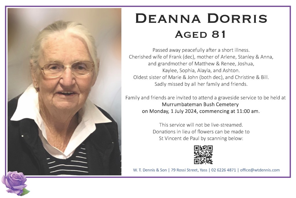 Family and friends are invited to attend a graveside service to be held at Murrumbateman Bush Cemetery on Monday, 1 July 2024, commencing at 11:00 am.