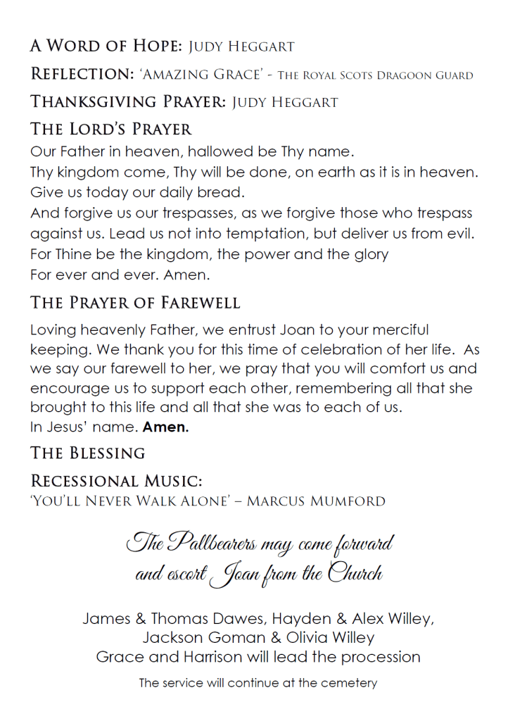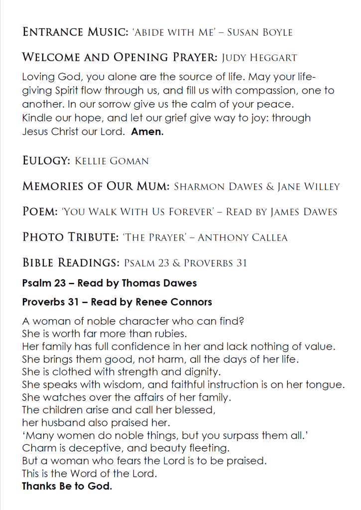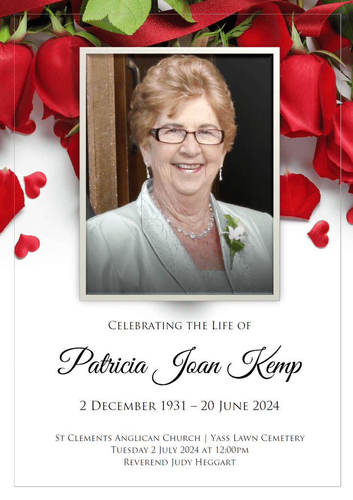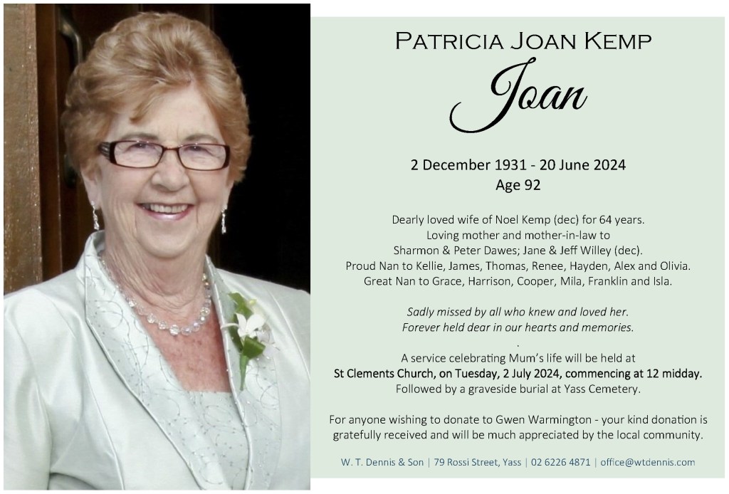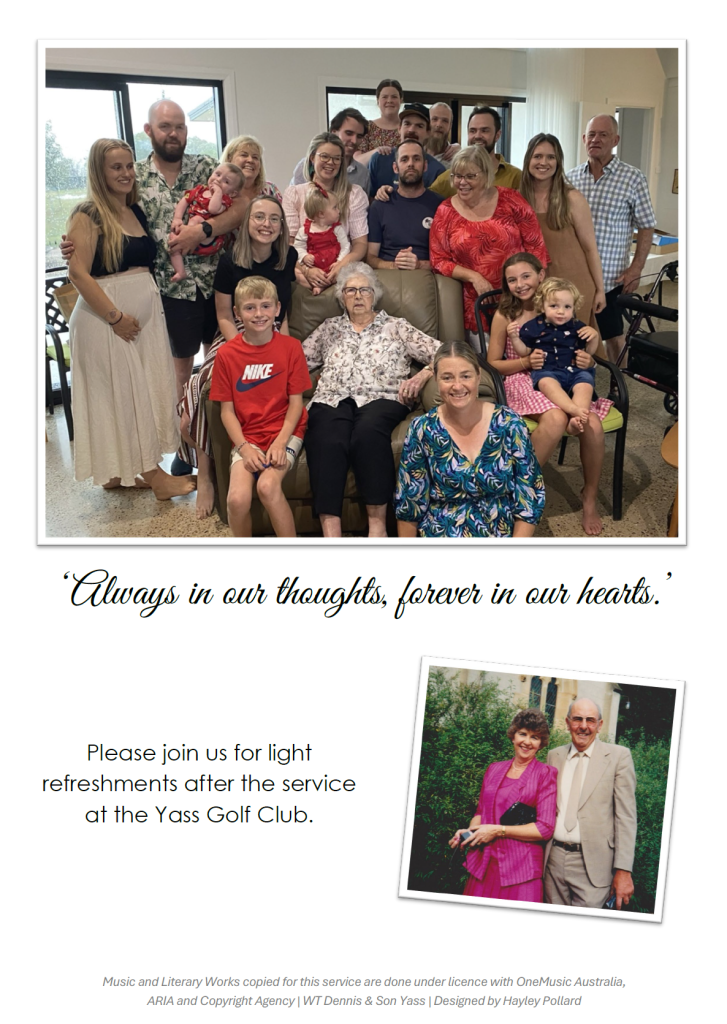 A service celebrating Mum’s life will be held at St Clements Church, on Tuesday, 2 July 2024, commencing at 12 midday. Followed by a graveside burial at Yass Cemetery.