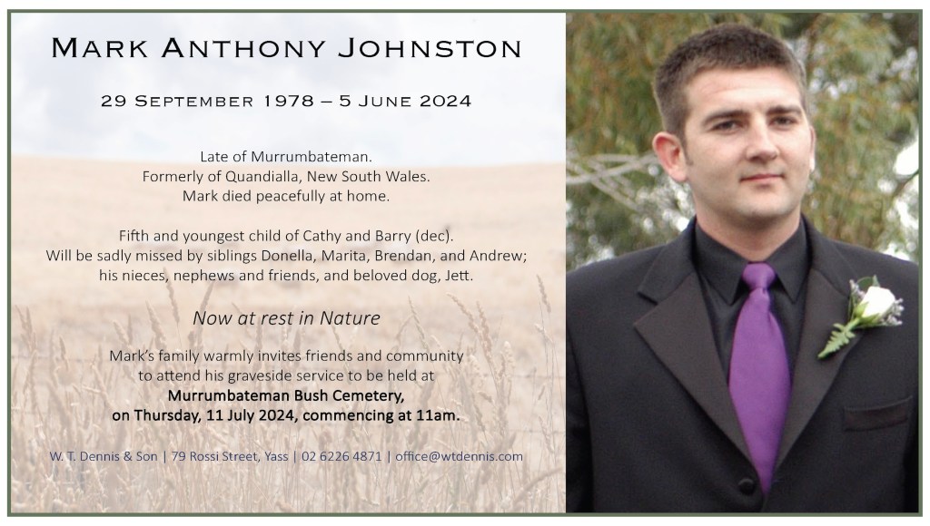 Mark’s family warmly invites friends and community to attend his graveside service to be held at Murrumbateman Bush Cemetery, on Thursday, 11 July 2024, commencing at 11am.
