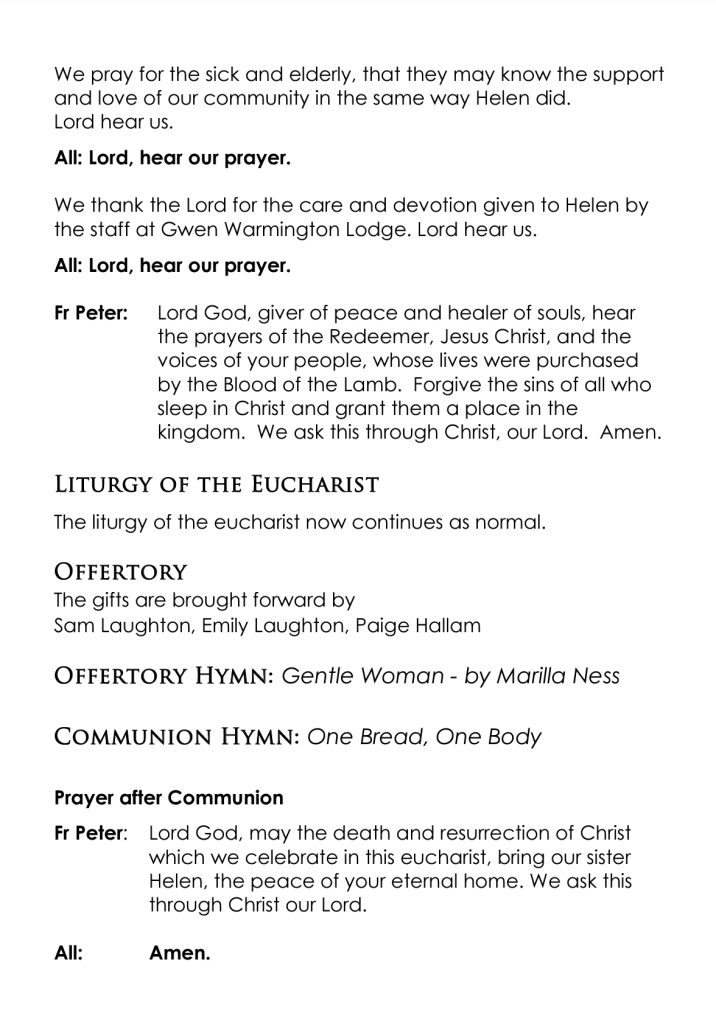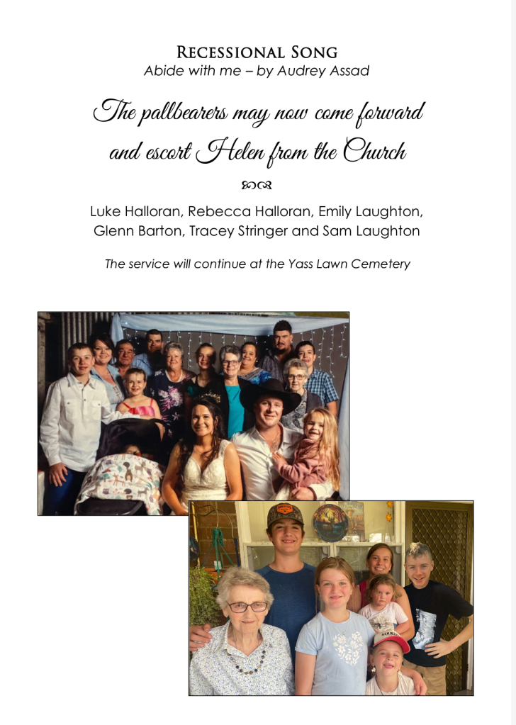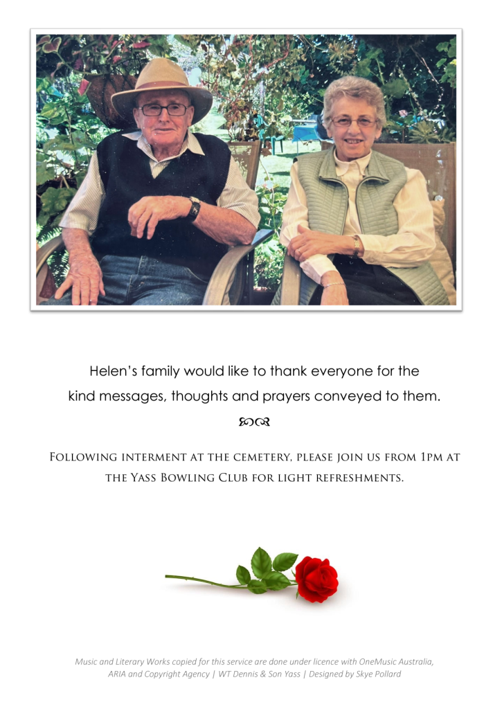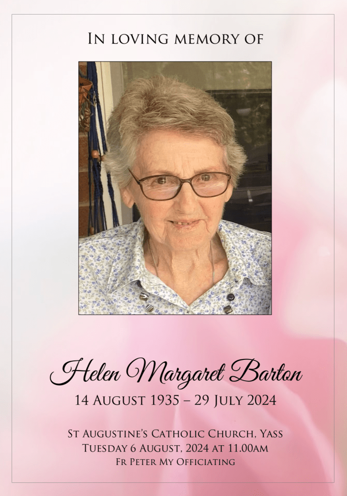All are warmly invited to attend her funeral service to be held on Tuesday, 6 August 2024, at St. Augustine’s Catholic Church, commencing at 11 am. The cortege will then leave for interment in the Yass Lawn Cemetery.