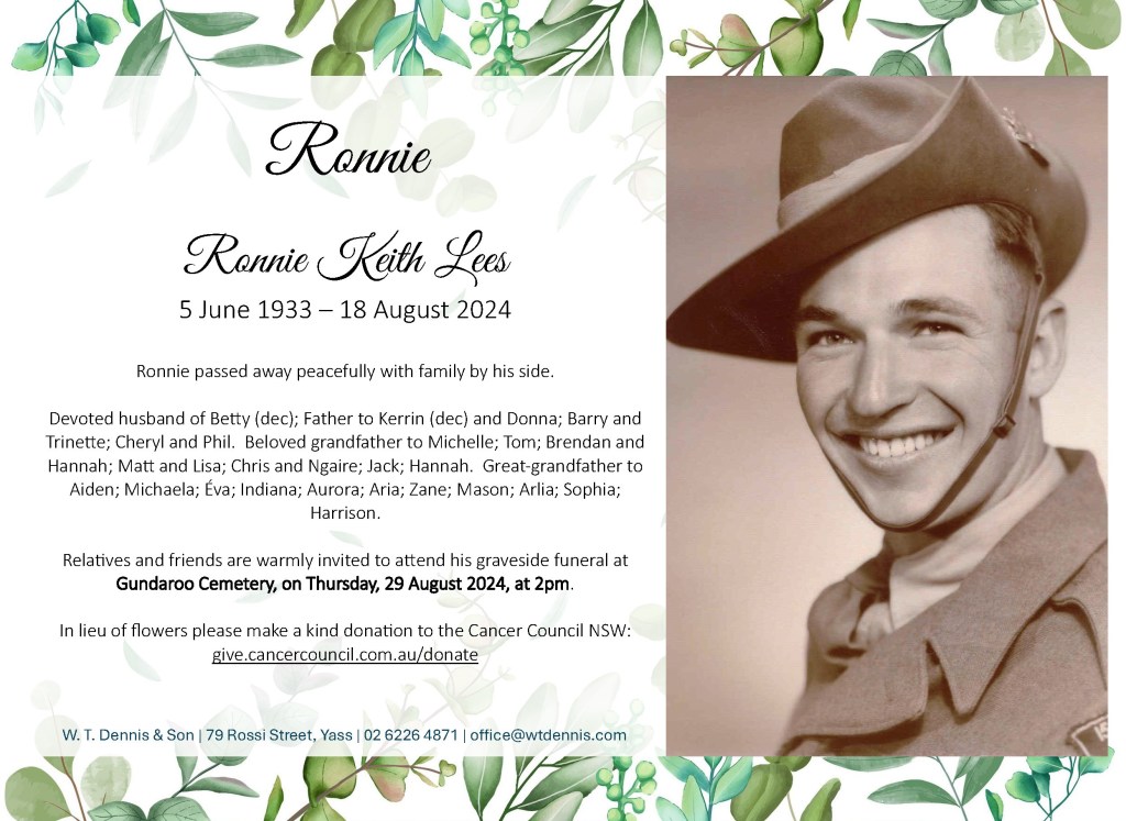 Relatives and friends are warmly invited to attend his graveside funeral at Gundaroo Cemetery, on Thursday, 29 August 2024, at 2pm.