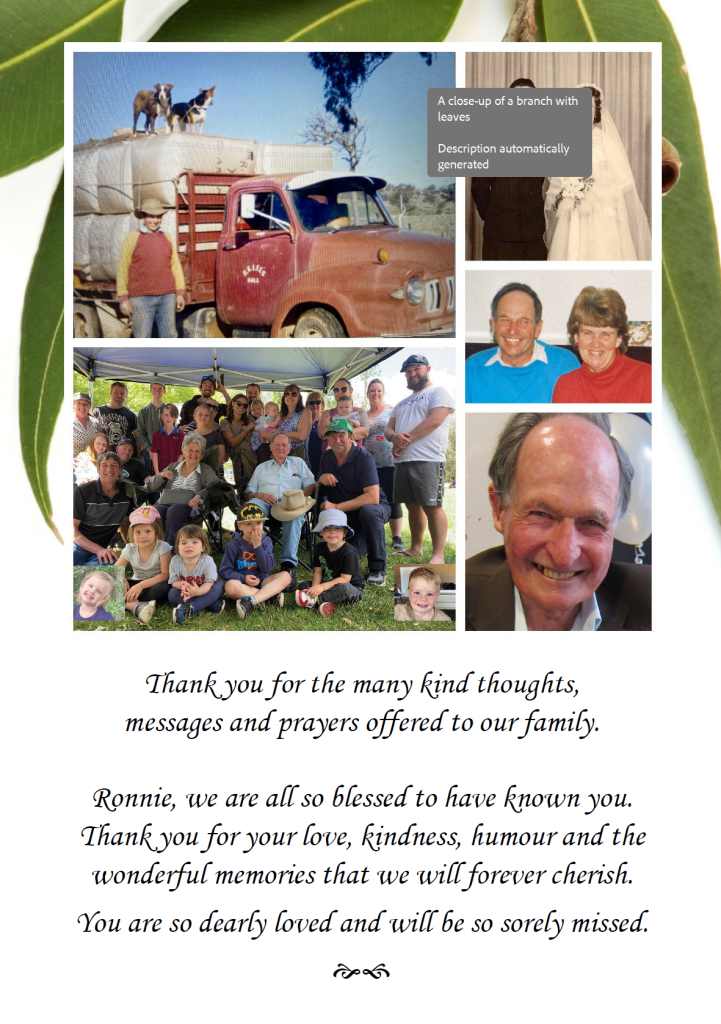 Devoted husband of Betty (dec); Father to Kerrin (dec) and Donna; Barry and Trinette; Cheryl and Phil. Beloved grandfather to Michelle; Tom; Brendan and Hannah; Matt and Lisa; Chris and Ngaire; Jack; Hannah. Great-grandfather to Aiden; Michaela; Éva; Indiana; Aurora; Aria; Zane; Mason; Arlia; Sophia; Harrison.