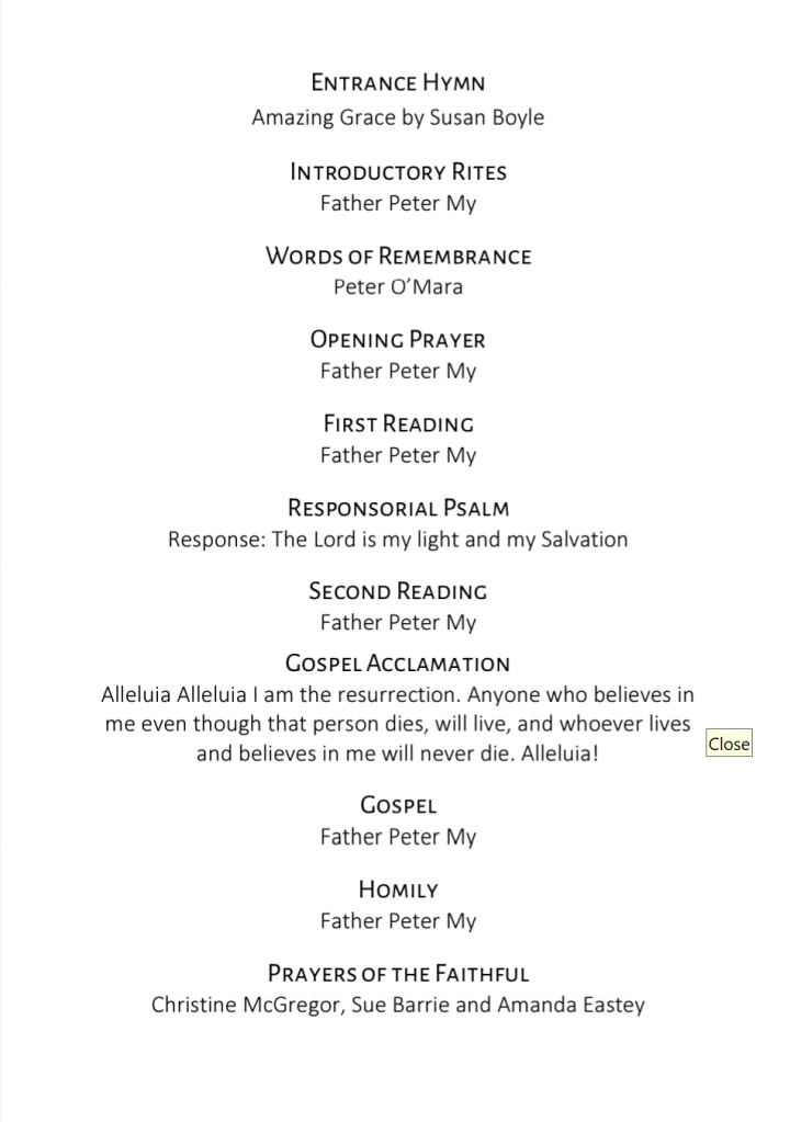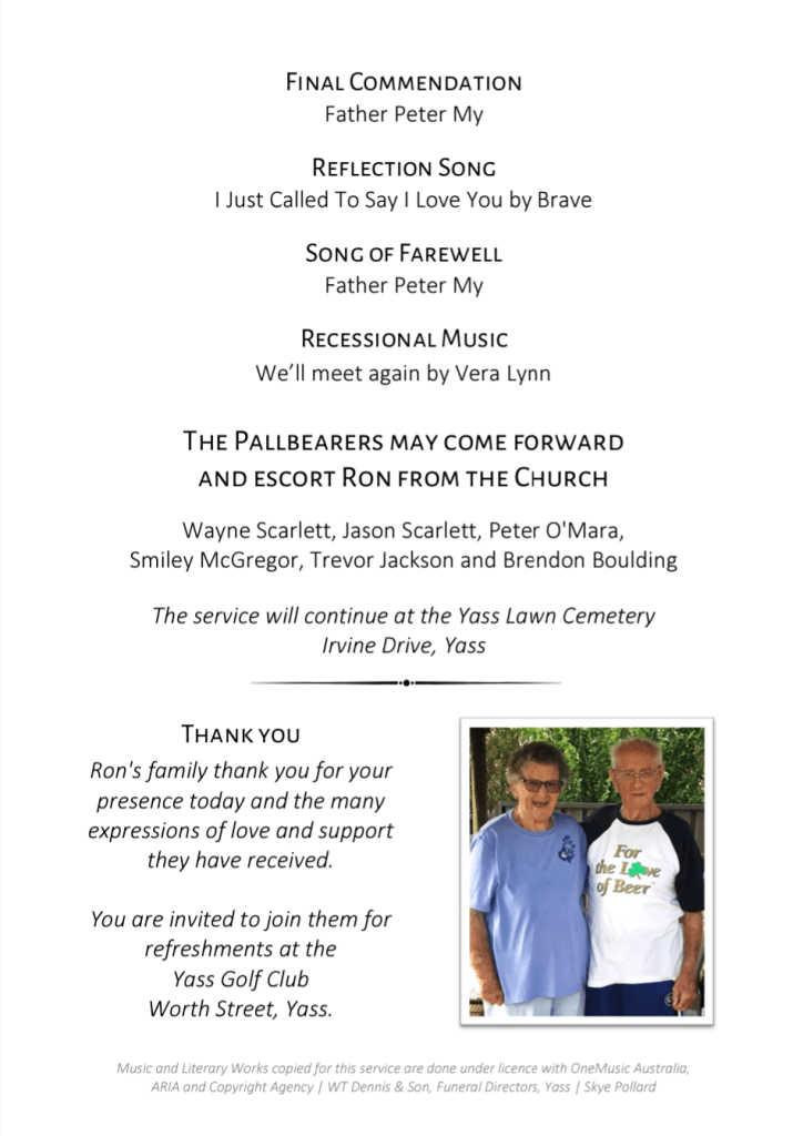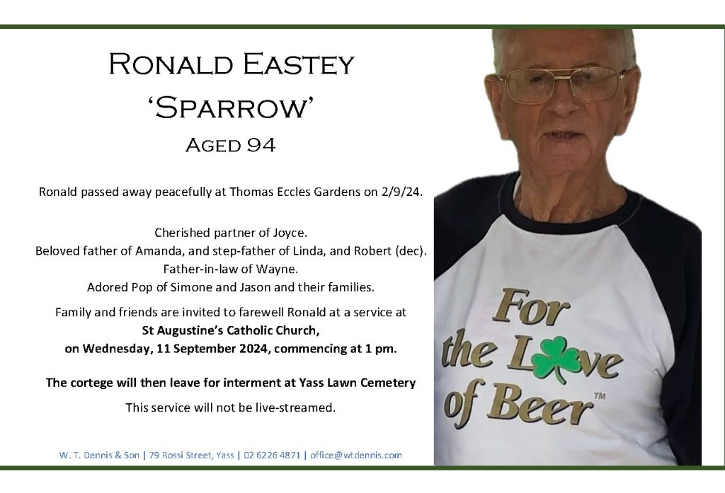 Family and friends are invited to farewell Ronald at a service at St Augustine’s Catholic Church, on Wednesday, 11 September 2024, commencing at 1 pm.