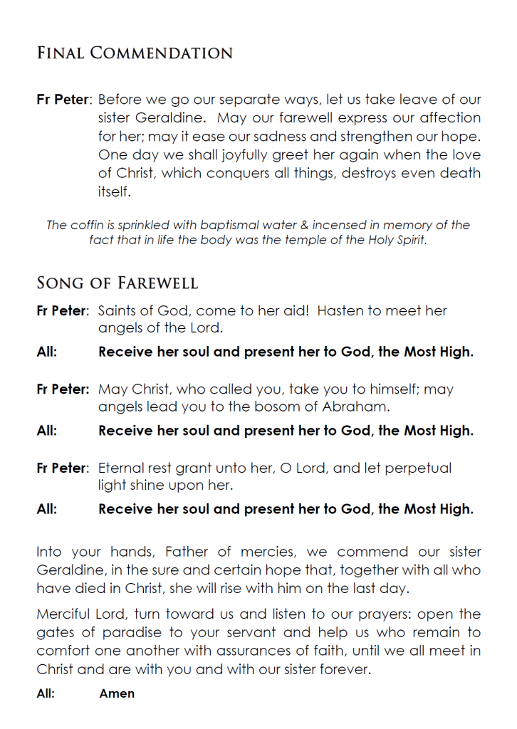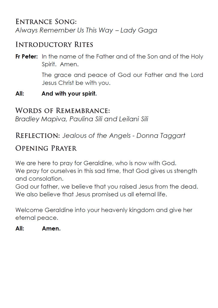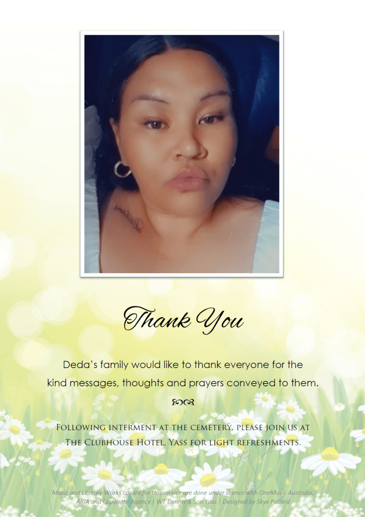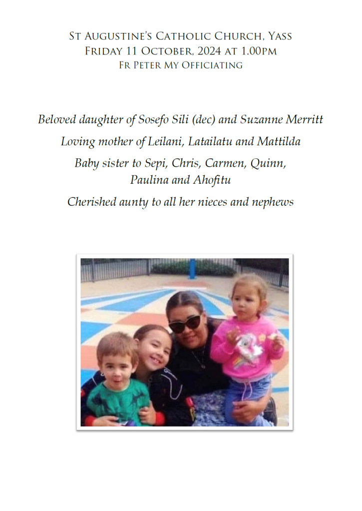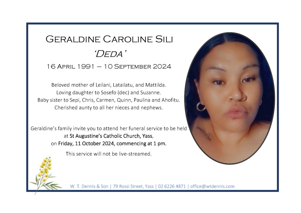 Geraldine’s family invite you to attend her funeral service to be held at St Augustine’s Catholic Church, Yass, on Friday, 11 October 2024, commencing at 1 pm.