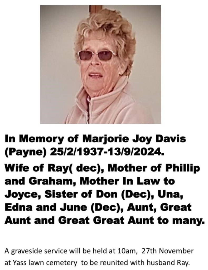 In memory of Marjorie Joy Davis (nee Payne) Posted on November 26, 2024November 26, 2024 by C Carroll Share this: Share on Facebook (Opens in new window) Facebook Email a link to a friend (Opens in new window) Email Like Loading...