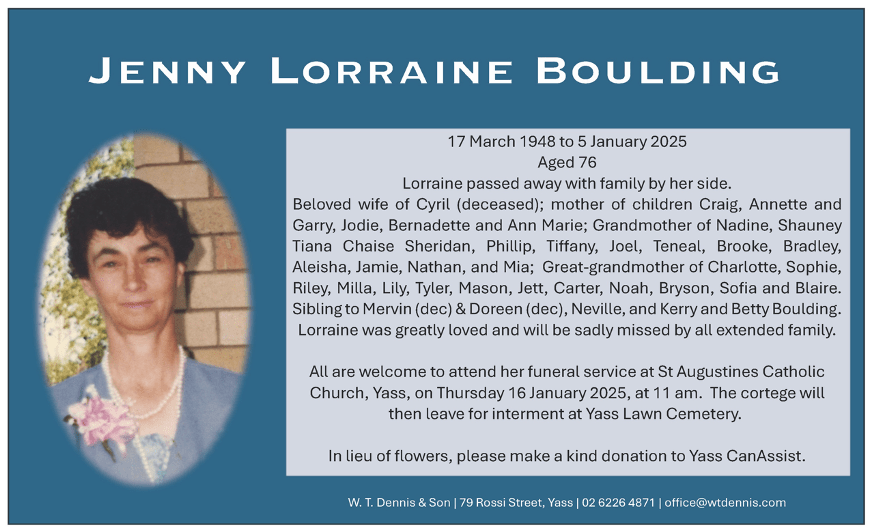 All are welcome to attend her funeral service at St Augustines Catholic Church, Yass, on Thursday, 16 January 2025, at 11 am. The cortege will then leave for interment at Yass Lawn Cemetery.