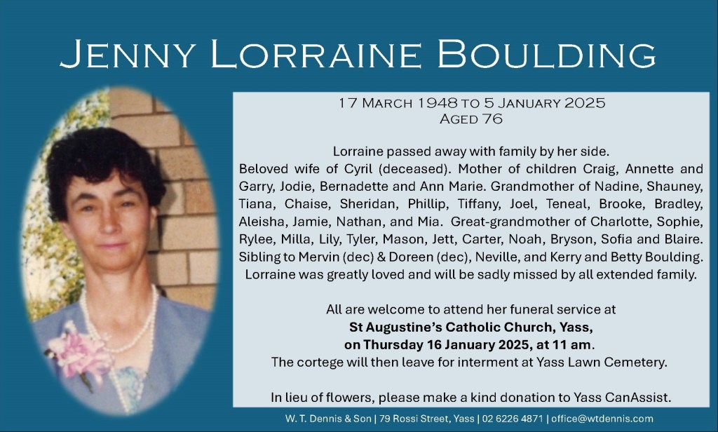 All are welcome to attend her funeral service at St Augustine’s Catholic Church, Yass, on Thursday 16 January 2025, at 11 am. The cortege will then leave for interment at Yass Lawn Cemetery.