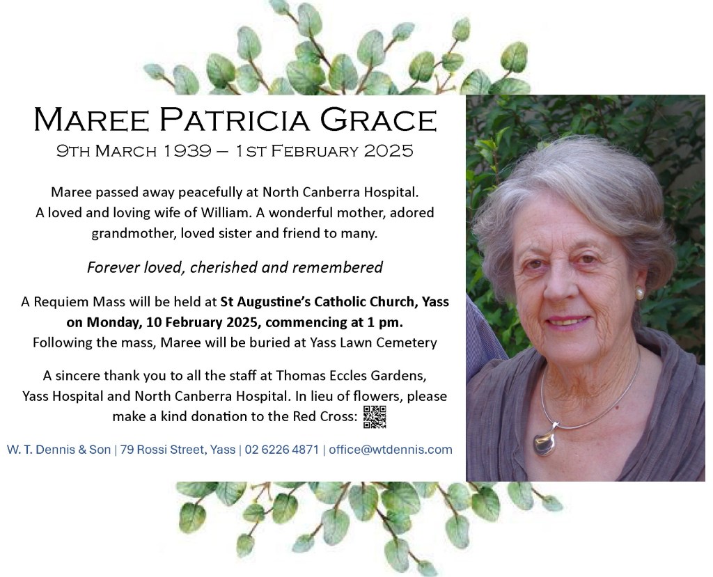 A Requiem Mass will be held at St Augustine’s Catholic Church, Yass on Monday, 10 February 2025, commencing at 1 pm. Following the mass, Maree will be buried at Yass Lawn Cemetery