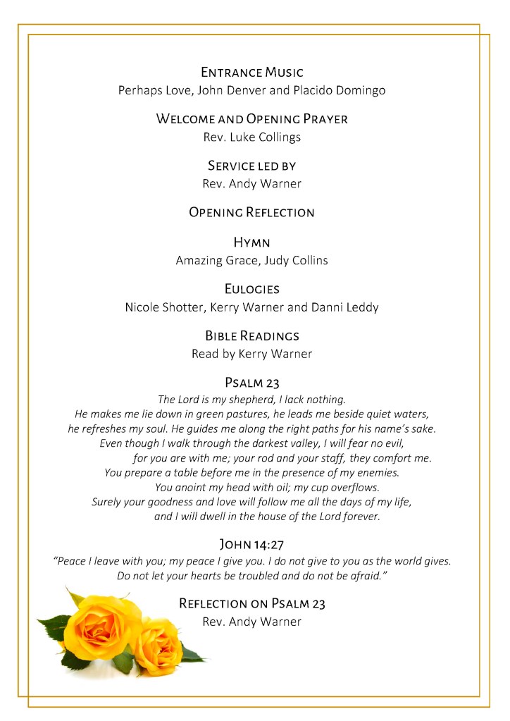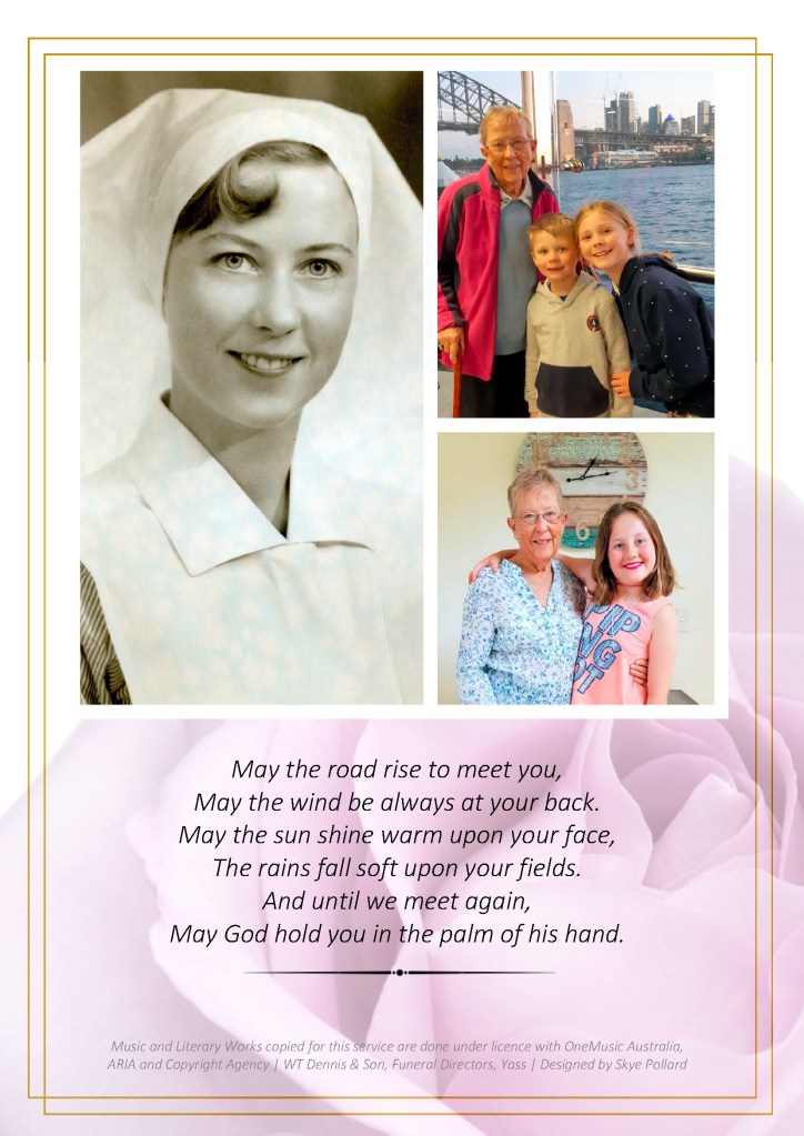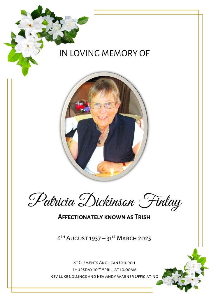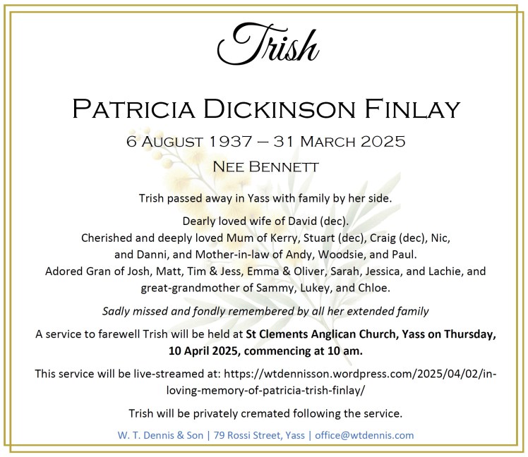 A service to farewell Trish will be held at St Clements Anglican Church, Yass on Thursday, 10 April 2025, commencing at 10 am.