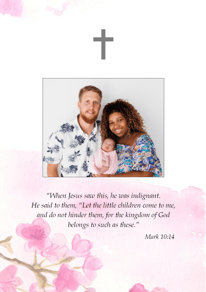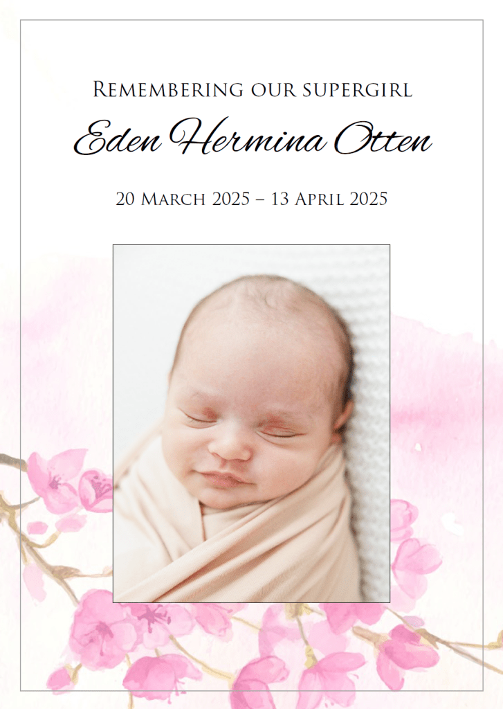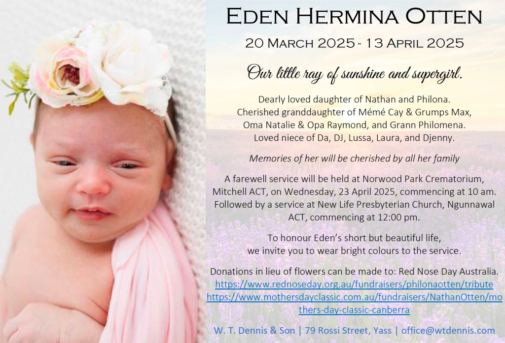To honour Eden’s short but beautiful life, we invite you to wear bright colours to the service.