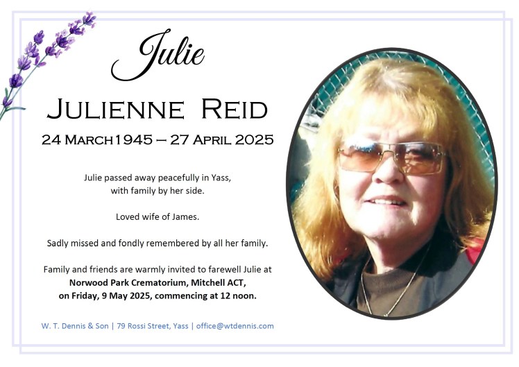 Family and friends are warmly invited to farewell Julie at Norwood Park Crematorium, Mitchell ACT, on Friday, 9 May 2025, commencing at 12 noon.