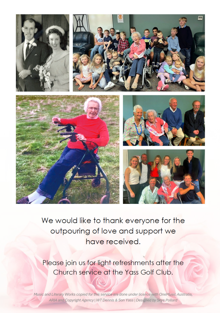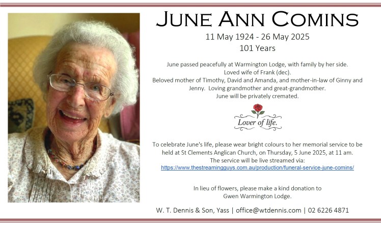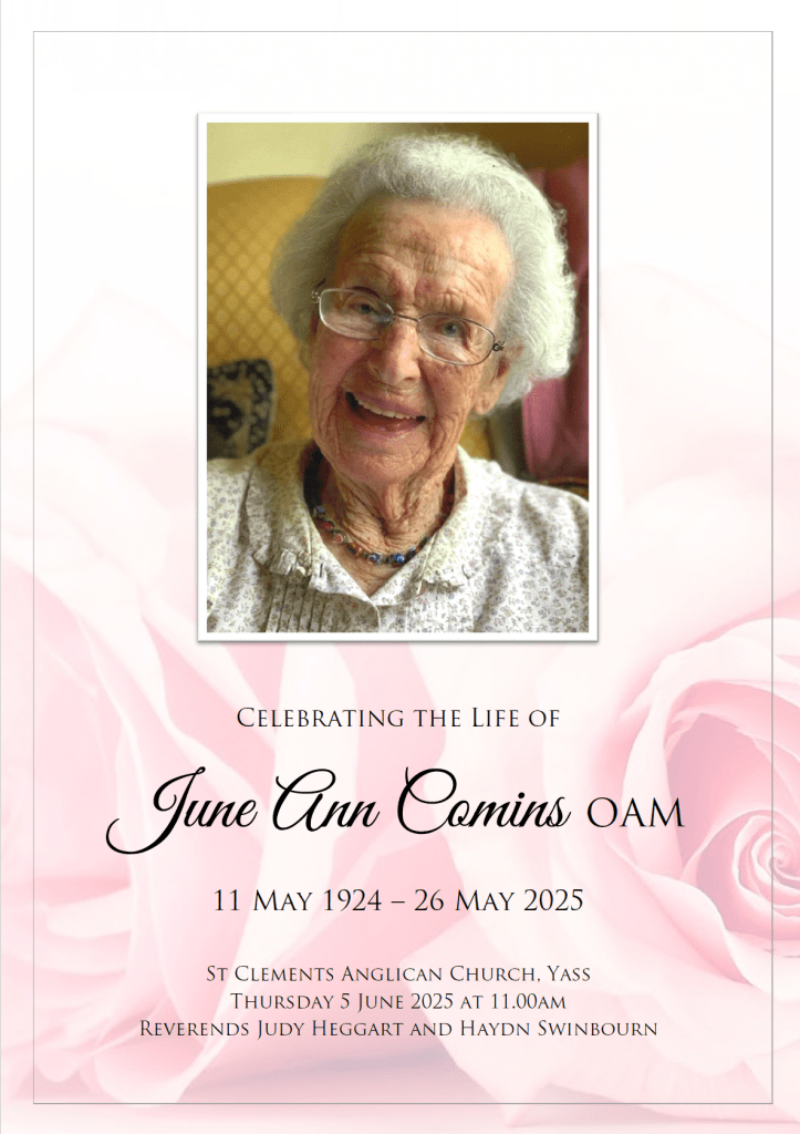 To celebrate June’s life, please wear bright colours to her memorial service to be held at St Clements Anglican Church, on Thursday, 5 June 2025, at 11 am.