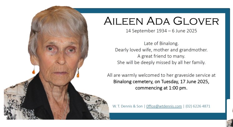 All are warmly welcomed to her graveside service at Binalong cemetery, on Tuesday, 17 June 2025, commencing at 1:00 pm.