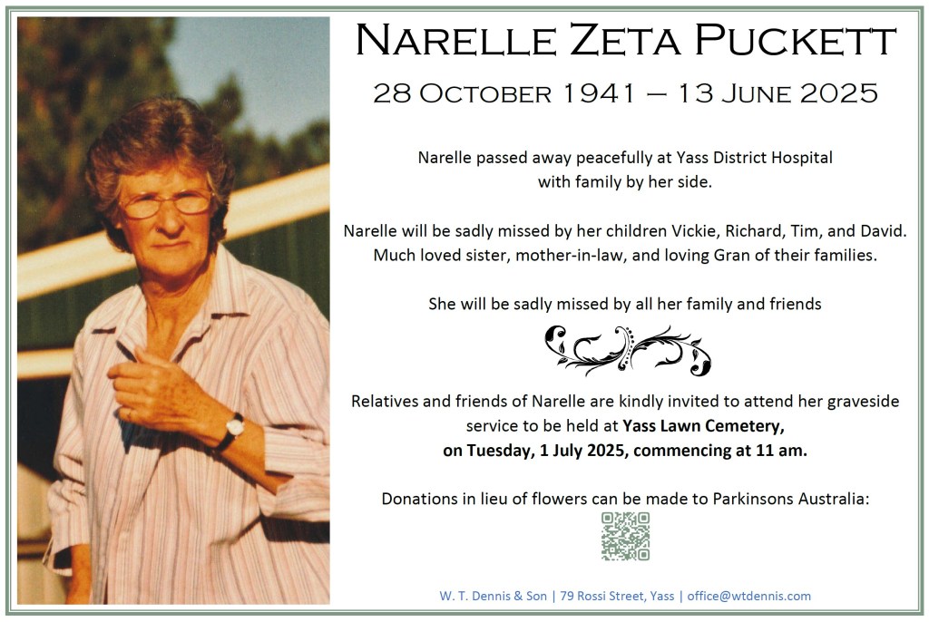 Relatives and friends of Narelle are kindly invited to attend her graveside service to be held at Yass Lawn Cemetery, on Tuesday, 1 July 2025, commencing at 11 am.