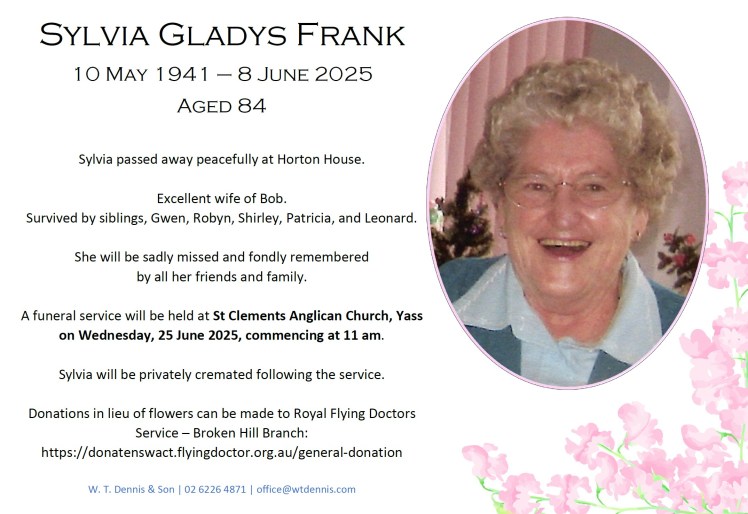 A funeral service will be held at St Clement’s Anglican Church, Yass, on Wednesday, 25 June 2025, commencing at 11 am.