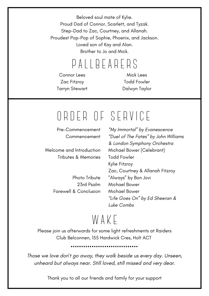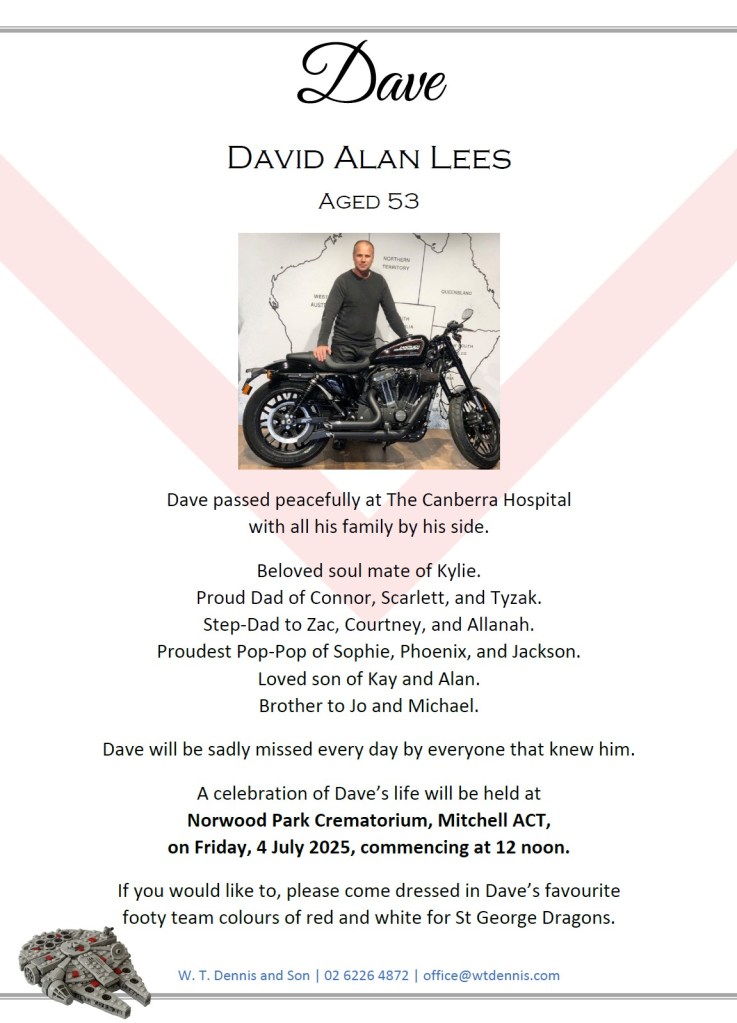 If you would like to, please come dressed in Dave’s favourite footy team colours of red and white for St George Dragons.