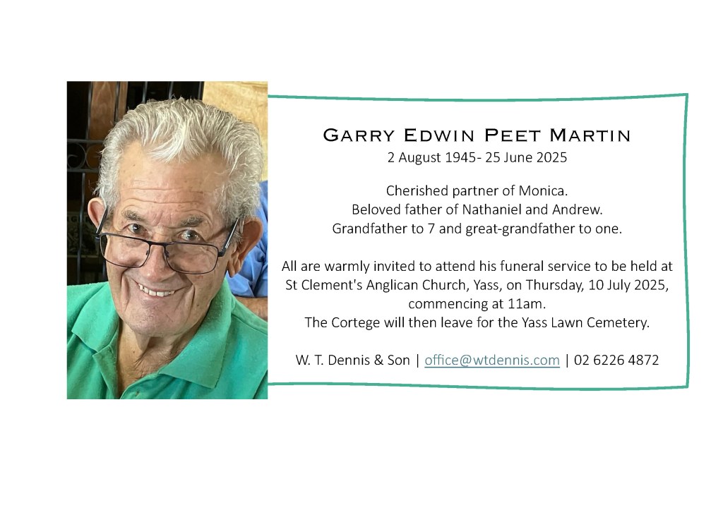 All are warmly invited to attend the funeral service for Garry, to be held at St Clement’s Anglican Church, Yass, on Thursday, 10 July 2025, at 11:00 a.m.