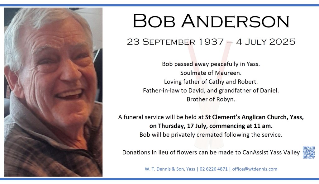 A funeral service will be held at St Clement’s Anglican Church, Yass, on Thursday, 17 July, commencing at 11 am.