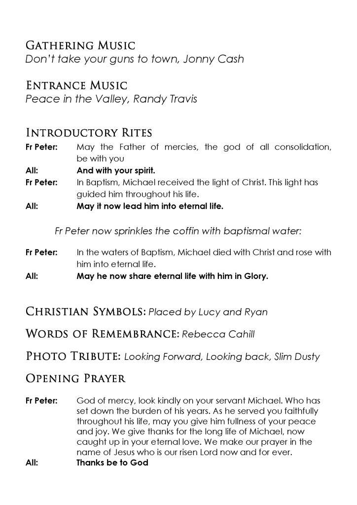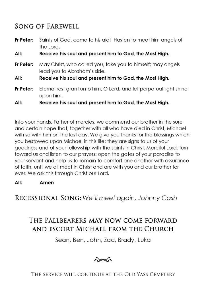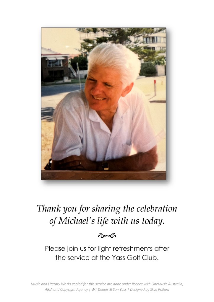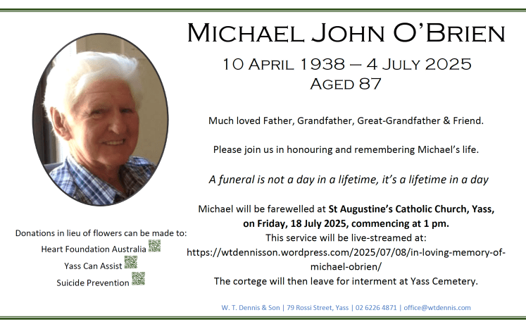 Michael will be farewelled at St Augustine’s Catholic Church, Yass,