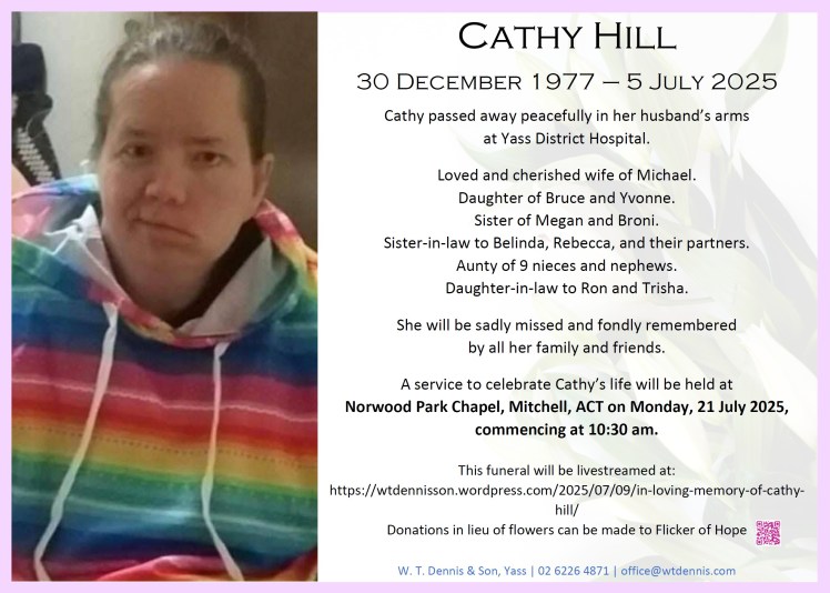 Cathy passed away peacefully in her husband’s arms at Yass District Hospital.