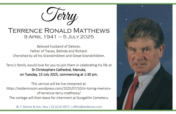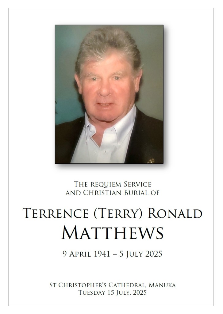 Terry’s family would love for you to join them in celebrating his life at St Christophers Cathedral, Manuka, on Tuesday, 15 July 2025, commencing at 1:30 pm.