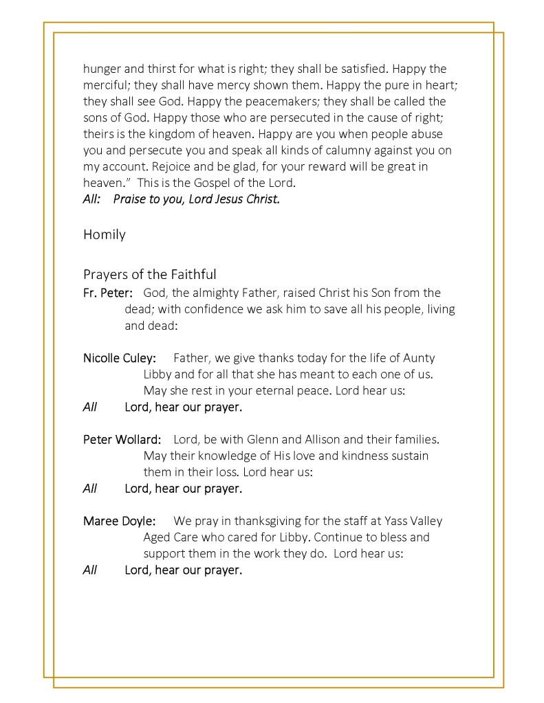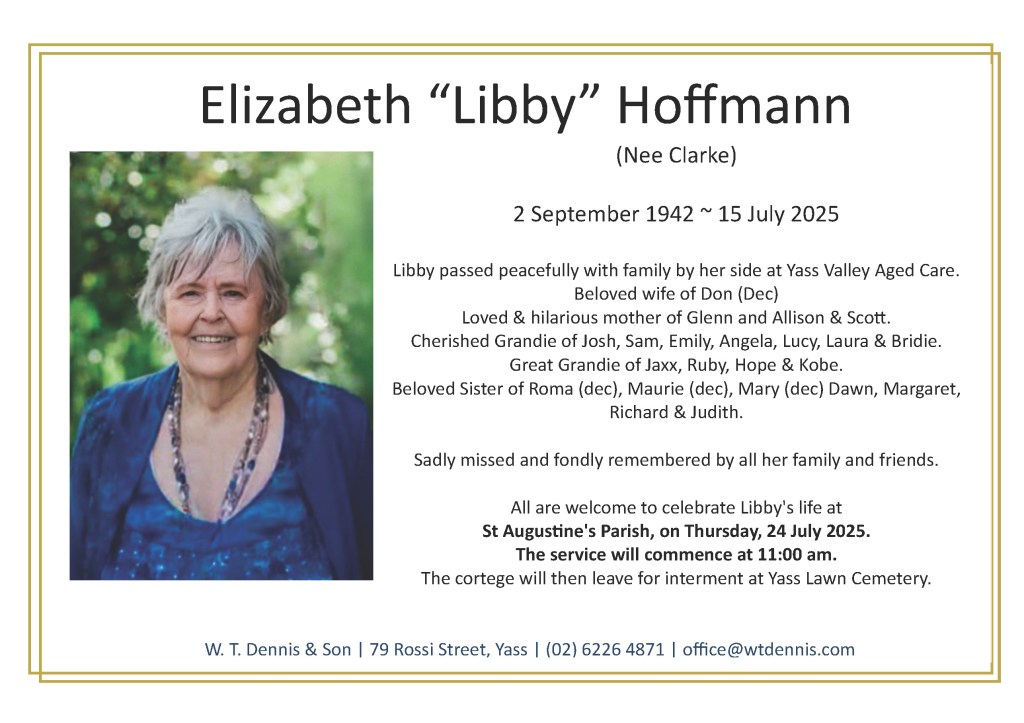 Libby passed peacefully with family by her side at Yass Valley Aged Care.