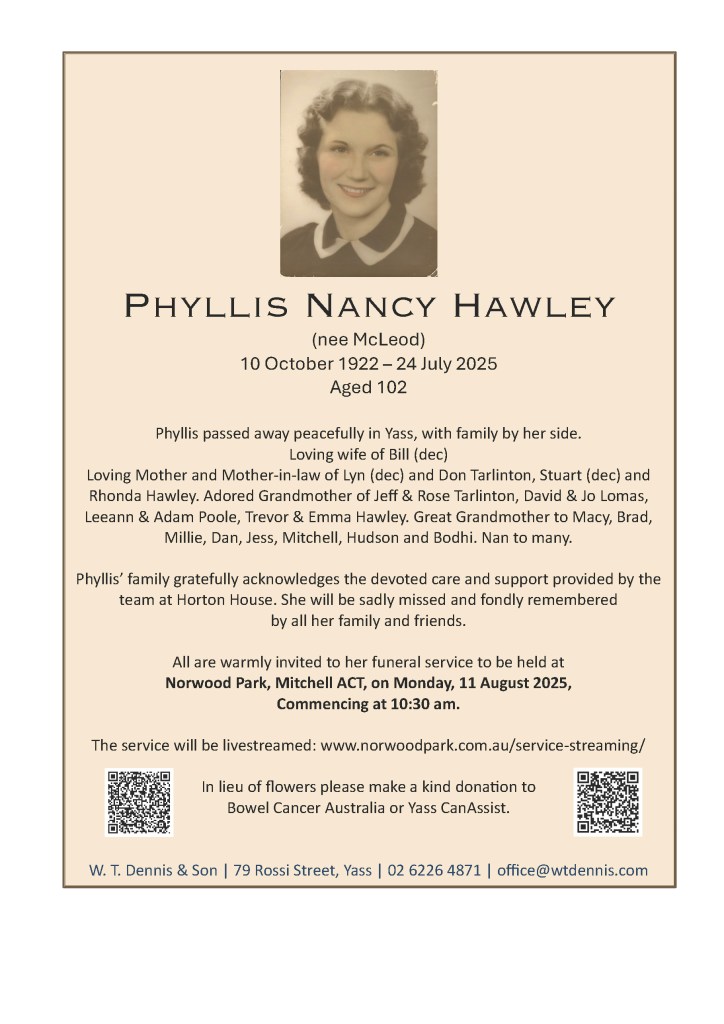Loving Mother and Mother-in-law of Lyn (dec) and Don Tarlinton, Stuart (dec) and Rhonda Hawley. Adored Grandmother of Jeff & Rose Tarlinton, David & Jo Lomas, Leeann & Adam Poole, Trevor & Emma Hawley. Great Grandmother to Macy, Brad, Millie, Dan, Jess, Mitchell, Hudson and Bodhi. Nan to many.