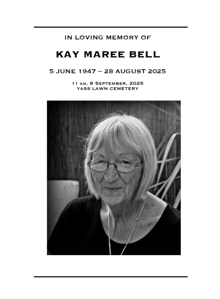 Kay will be farewelled in a graveside service to be held at Yass Lawn Cemetery on Tuesday, 9 September 2025, commencing at 11 am.
