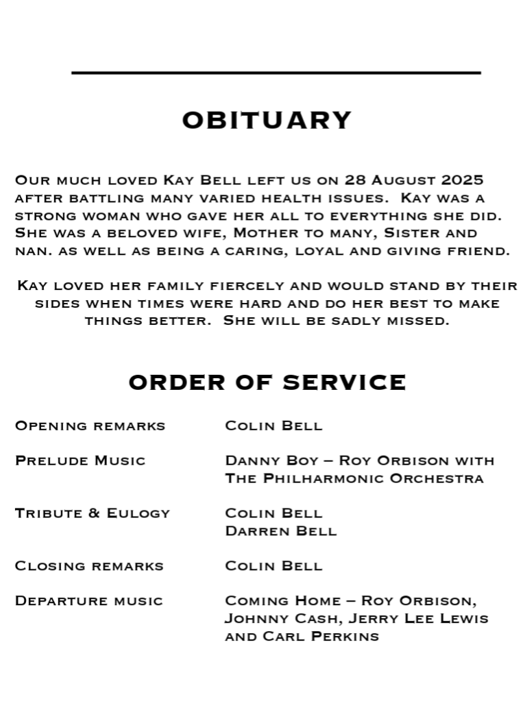 This service will be live-streamed: https://attnd.com.au/kay-bell