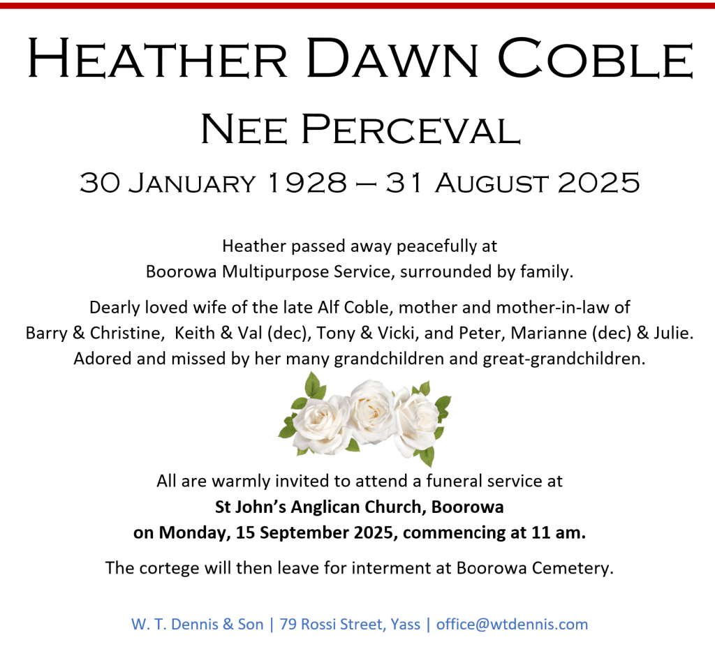 Heather passed away peacefully at Boorowa Multipurpose Service, surrounded by family.