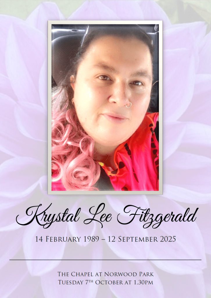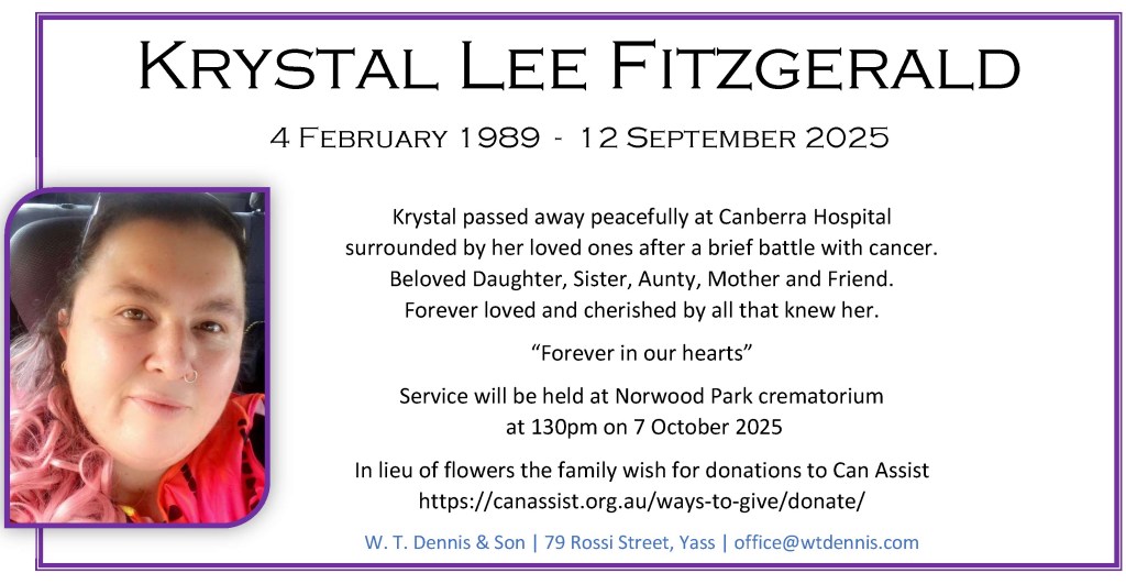 Krystal passed away peacefully at Canberra Hospital,