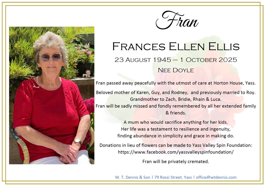 Fran passed away peacefully with the utmost of care at Horton House, Yass.