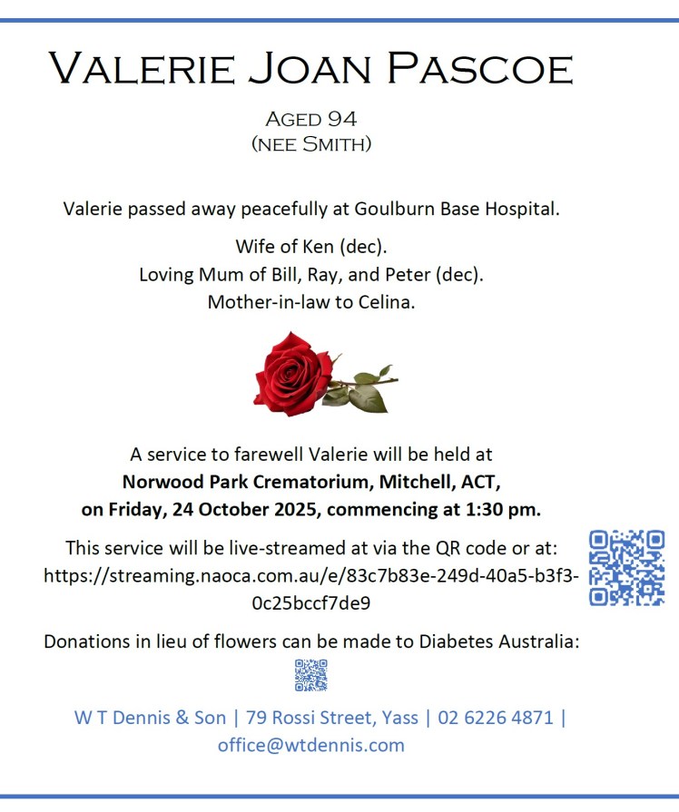 Valerie passed away peacefully at Goulburn Base Hospital.