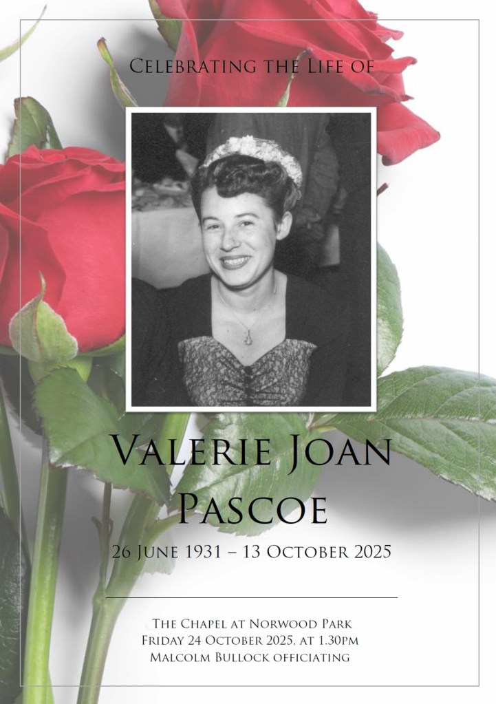 A service to farewell Valerie will be held at Norwood Park Crematorium, Mitchell, ACT,