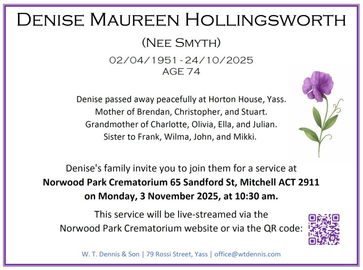 Denise’s family invite you to join them for a service at Norwood Park Crematorium 65 Sandford St, Mitchell ACT 2911 on Monday, 3 November 2025, at 10:30 am.