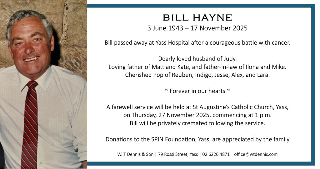 A farewell service will be held at St Augustine’s Catholic Church, Yass, on Thursday, 27 November 2025, commencing at 1 p.m. Bill will be privately cremated following the service.