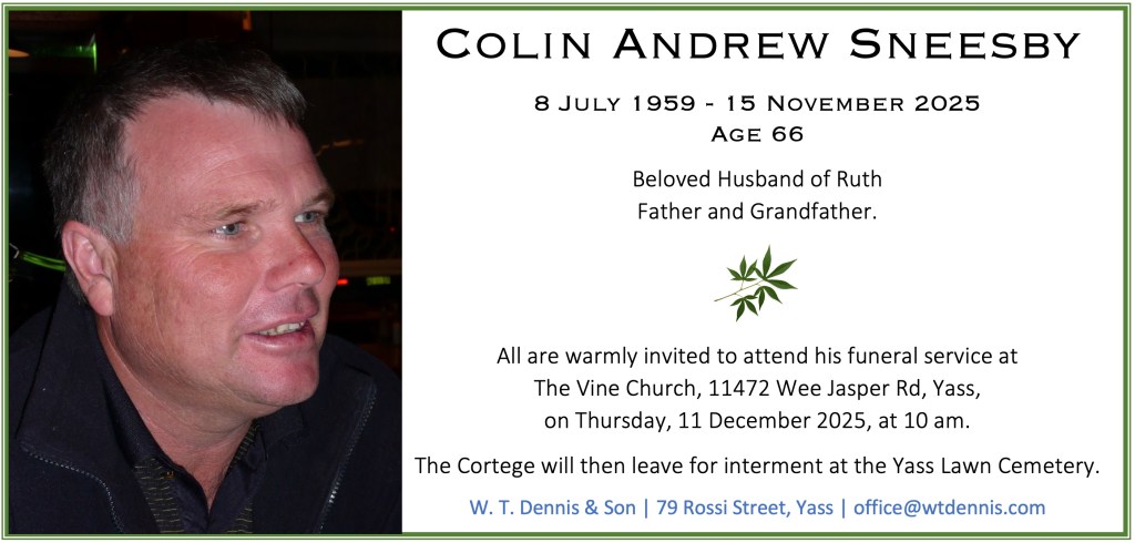 All are warmly invited to attend his funeral service at The Vine Church, 11472 Wee Jasper Rd, Yass, on Thursday, 11 December at 10am.