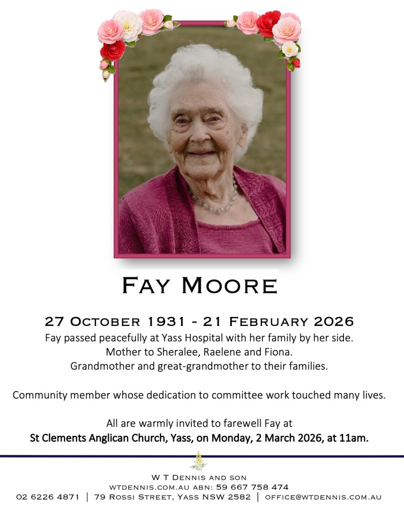 Fay passed away peacefully at Yass Hospital with her family by her side.