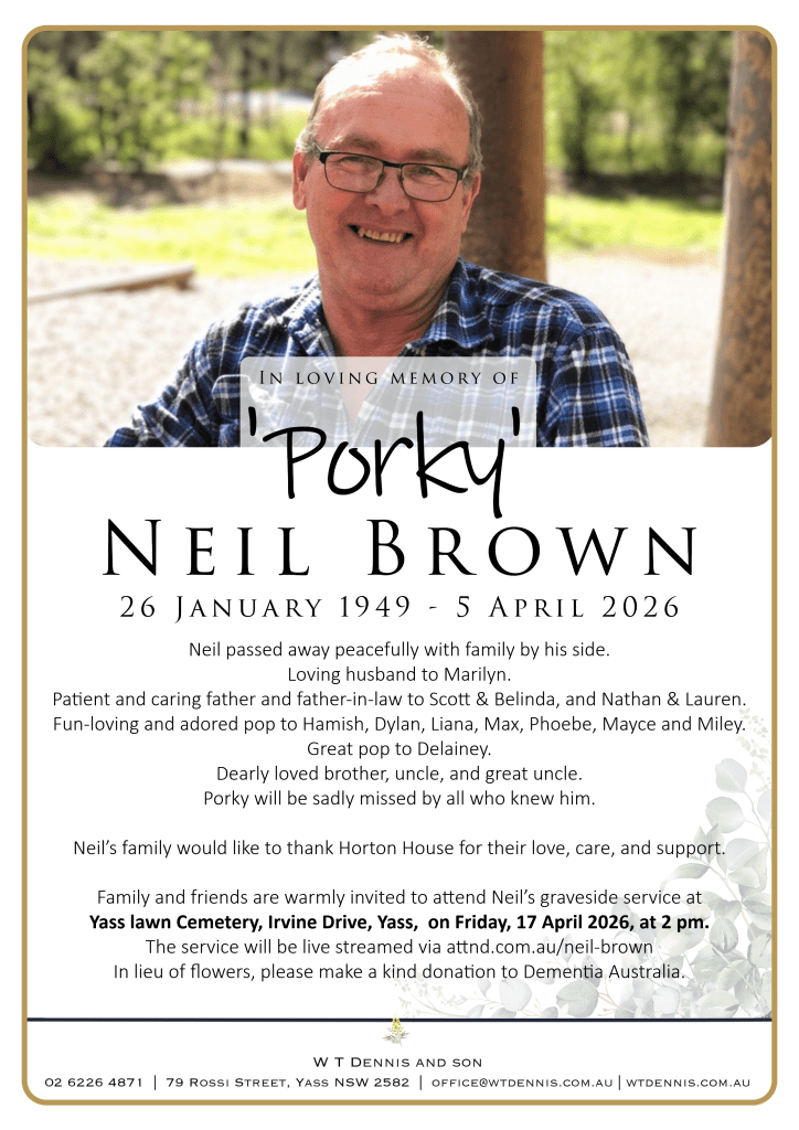 Yass lawn Cemetery, Irvine Drive, Yass, on Friday, 17 April 2026, at 2 pm.