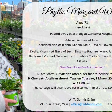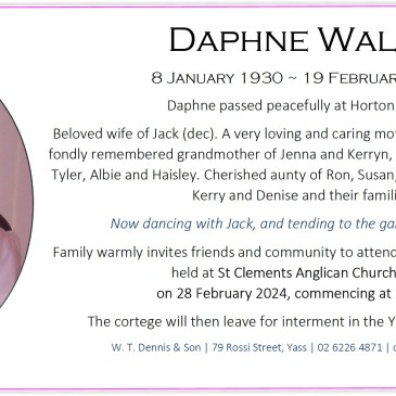 Daphne Wales, who passed away at Horton House, is remembered as a beloved wife, mother, grandmother, and great-grandmother. The funeral service will take place on 28 February 2024 at St Clements Anglican Church, Yass. She reunites with her late husband, Jack, in heaven. … More In loving memory of Daphne Wales