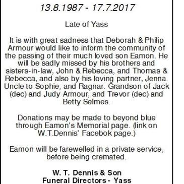 Mavis Verna Armour (nee Drennan) 31/7/1928 – 13/10/2017 Mavis sadly passed away at Warmington Lodge. Formerly of Bookham & late of Yass. Beloved wife of Ken (dec) Mother and mother-in-law of Wendy & William Williams (Batemans Bay), Roslyn & Brian Corcoran (Yass), and Helen & Barry Bush (Yass) Dearly loved mumma to her grandchildren and … More Mavis Armour Funeral Service