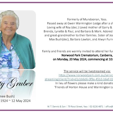 Betty Gruber, formerly of Mundoonan, Yass, passed away at Gwen Warmington Lodge. She was a loving wife, mother, grandmother, and great-grandmother. Her funeral service will be held on May 20, 2024, in Canberra. Livestream available. In lieu of flowers, donations to ‘Friends of Horton House and Warmington Lodge’ are appreciated. … More In memory of Betty Gruber